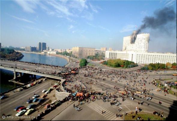 Мне было тогда 20 лет и в Питере те события в моём окружении особенно не обсуждались: в принципе, многих устраивала формулировка, согласно которой вождь новой России Ельцин подавил ползучую гадину советской контрреволюции, которая состояла из Верховного Совета и нескольких десятков люмпенов, страстно желавших уличных беспорядков. Смущало только, что кадры расстрела Белого дома на весь мир передавал американский телеканал CNN. Когда я однажды оказался в тех местах, где шла стрельба, увидел деревянный крест, цветы и надписи — о том, что здесь погибли герои, защищавшие свою страну. Признаюсь, в тот момент что-то дрогнуло в сердце: “сброд, каким сторонников Верховного Совета выставляло телевидение, не способен так помнить своих товарищей!
