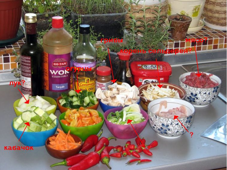 Верхний ряд с лева на права, то что на фотке: Лук. огурцы, грибы, корень сельдерея, говядина. Ниже кабачок, кабачок, морковка, болгарский перец, лук парей, курица.