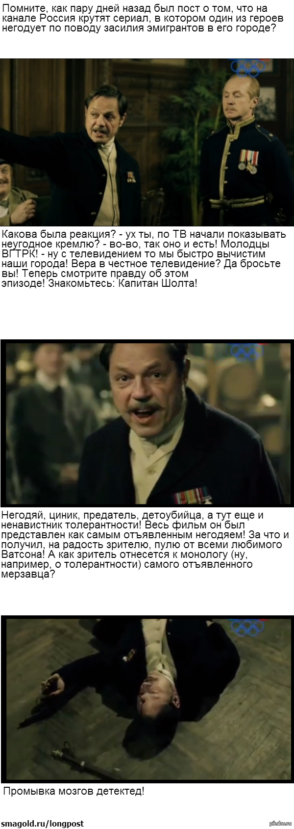 Сначала отъявленный мерзавец ругает толерастов, а потом его убивает положительный доктор Уотсон, ну да промывка мозгов дэтэктэд!