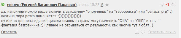 да, например можно везде включить автозамену "ополченцы" на "террористы" или "сепаратюги" :) картина мира резко поменяется :)))))))))))))))