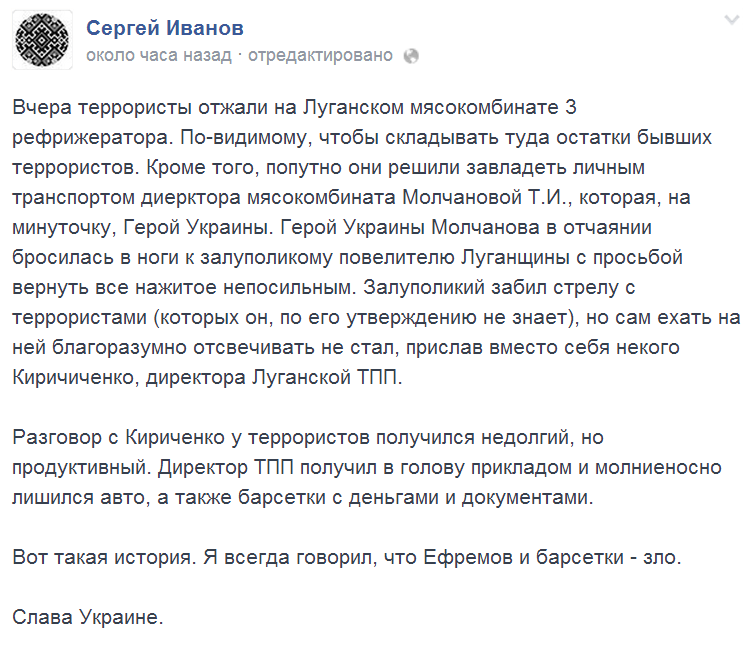 "Вчера террористы отжали на Луганском мясокомбинате 3 рефрижератора. По-видимому, чтобы складывать туда остатки бывших террористов. Кроме того, попутно они решили завладеть личным транспортом диерктора мясокомбината Молчановой Т.И., которая, на минуточку, Герой Украины. Герой Украины Молчанова в отчаянии бросилась в ноги к залуполикому повелителю Луганщины с просьбой вернуть все нажитое непосильным. Залуполикий забил стрелу с террористами (которых он, по его утверждению не знает), но сам ехать на ней благоразумно отсвечивать не стал, прислав вместо себя некого Киричиченко, директора Луганской ТПП.
