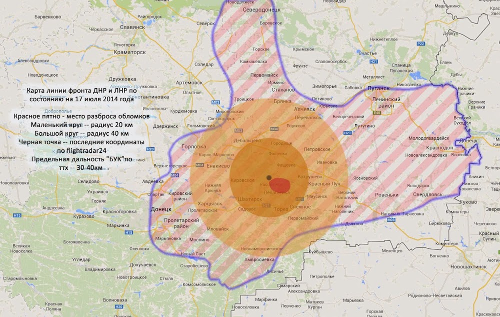 Ну, во-первых, самолет после попадания, летит не камнем вниз, а какое-то время по инерции вперед. А скорость почти 900 км/ч. Т.е. 15 км/мин. Если самолет падал хотя бы 2-3 минуты, а падал он дольше, то получается, что сбит он был фактически на границе военных дествий. И сделать это могли как ополченцы, так и официальный киев.