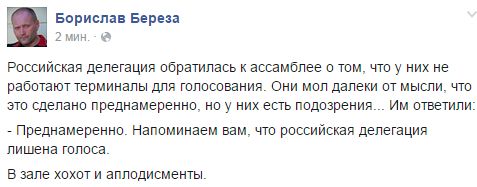"Преднамеренно. Напоминаем вам, что российская делегация лишена голоса."