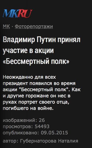 "В соцсетях высмеивают ляп пропагандистов Кремля, поскольку Путин родился в 1952 году, а война закончилась в 1945 году. Между тем, во время акции «Бессмертный полк», посвященной Дню победы, президент РФ нес портрет «погибшего на войне отца»."