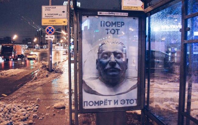 "В 63-ю годовщину смерти Иосифа Сталина на остановке у Павелецкого вокзала в Москве появился плакат с посмертной маской тирана и словами «Помер тот, помрет и этот»."