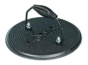 У меня дома есть гриль-сковорода из чугуна с тяжёлой крышкой, но её размер меня не удовлетворяет в процессе приготовления цыплёнка тапака — приходится пользоваться прижимным грузом.