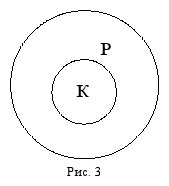 Понятия находятся в отношении подчинения в том случае, когда объём одного из них обязательно больше объёма другого и полностью его в себя включает (один объём как бы подчиняется другому). Например, в отношении подчинения находятся понятия "карась" (К) и "рыба" (Р), т. к. все караси — это обязательно рыбы, но рыбами являются не только караси, есть и другие виды рыб. Таким образом, объём понятия "карась" является меньшим по отношению к объёму понятия "рыба" и полностью в него включается (подчиняется ему). В отношении подчинения понятия с меньшим объёмом называются видовыми, а с большим — родовыми. На схеме Эйлера отношение подчинения изображается двумя кругами, один из которых располагается внутри другого (рис. 3).